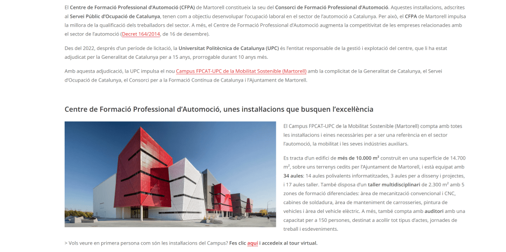 The Consorci de Formació Professional d’Automoció (CFPA) is a Catalan institution established through collaboration between the regional government and leading automotive companies to advance education and training in Catalonia’s automotive sector.