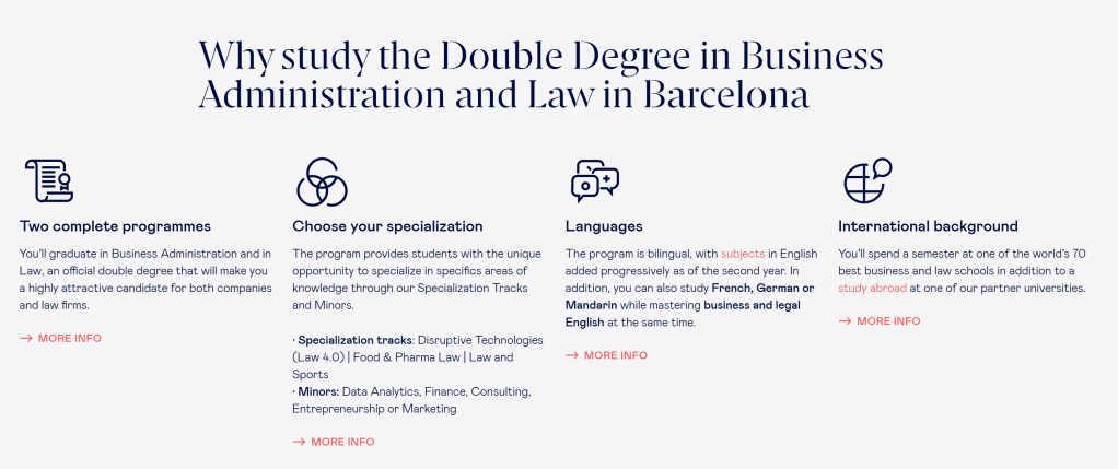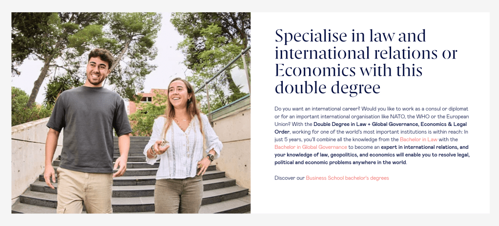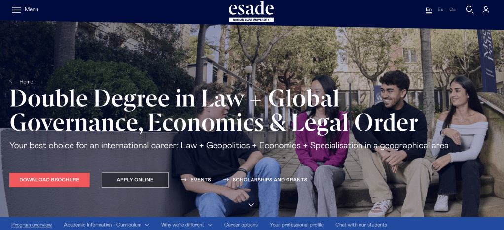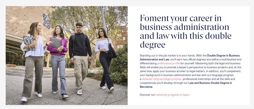 I crafted the website copy for Esade’s Double Degree in Business Administration and Law, highlighting the program’s unique integration of business acumen and legal expertise. The content showcased the program’s structure, international focus, and career prospects, effectively engaging prospective students while maintaining Esade’s prestigious brand voice. This work exemplified my ability to convey complex academic offerings in an accessible and inspiring way.
